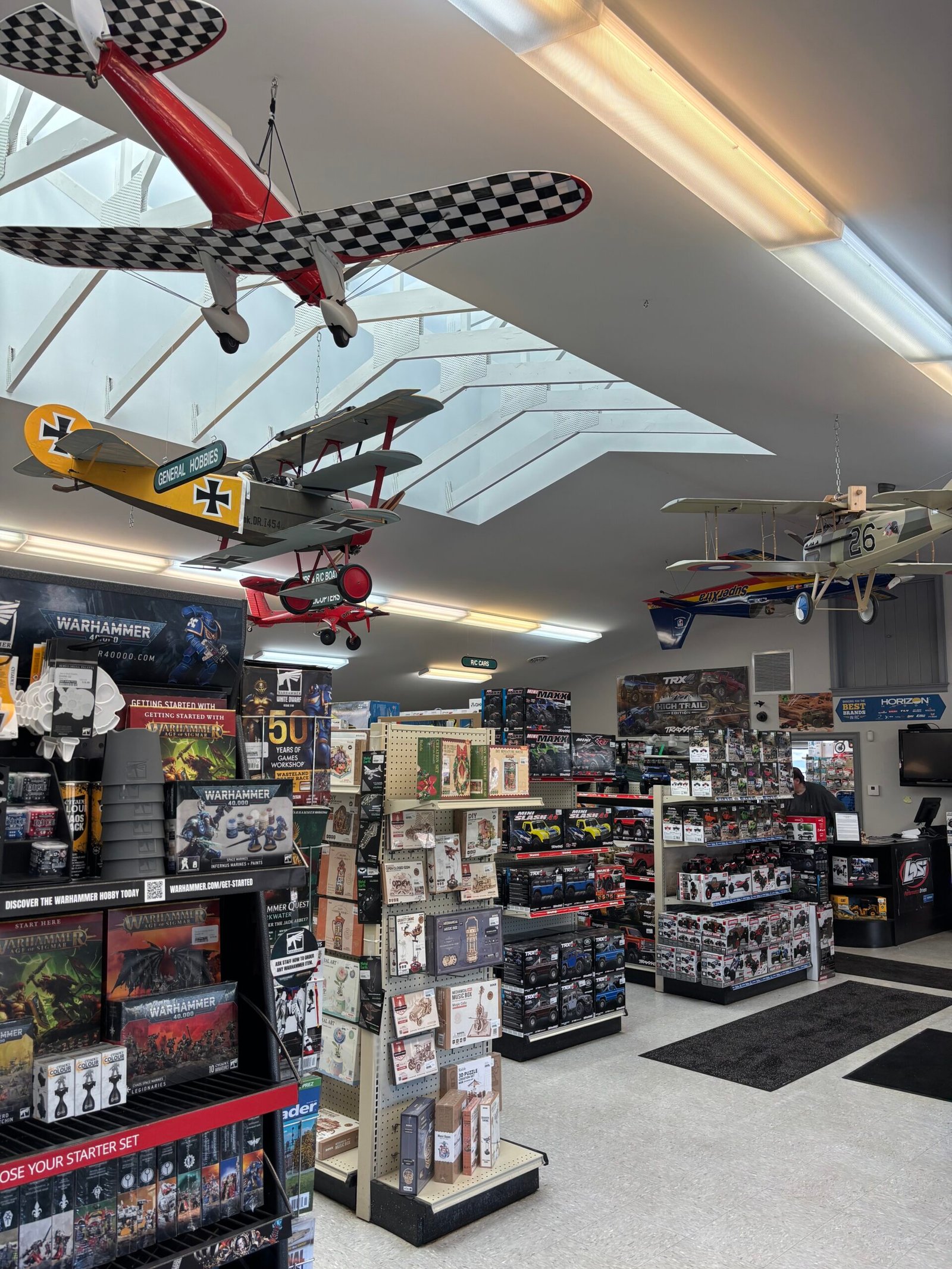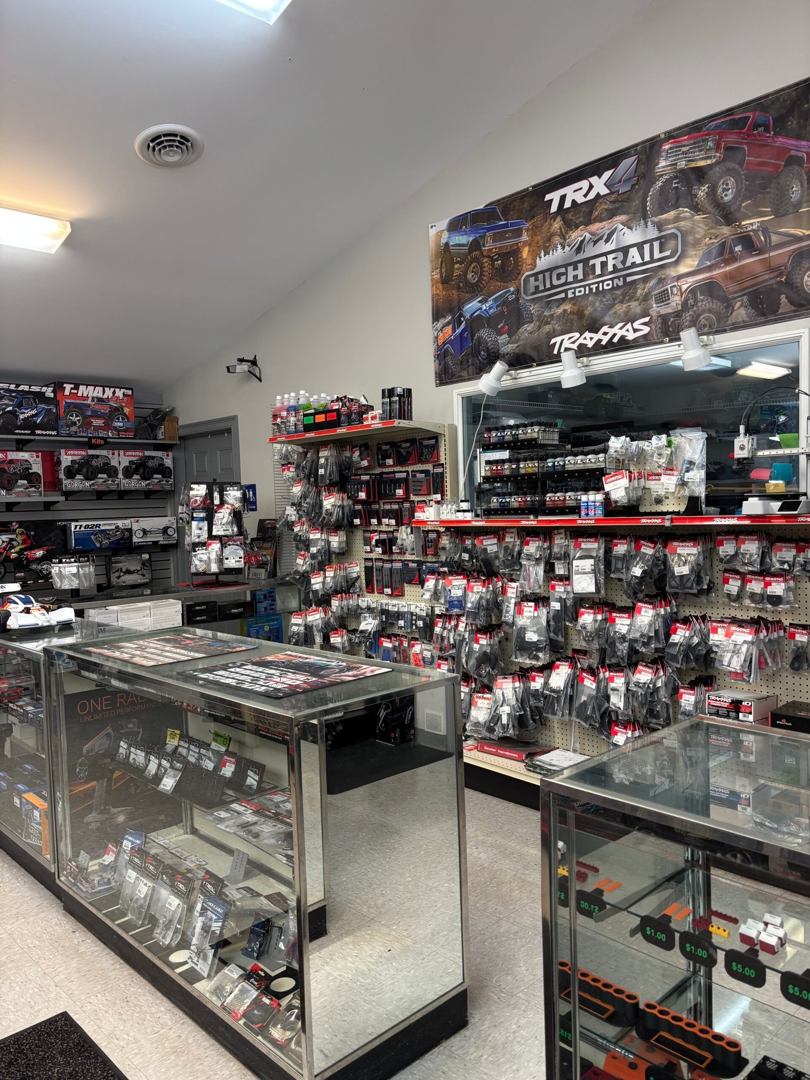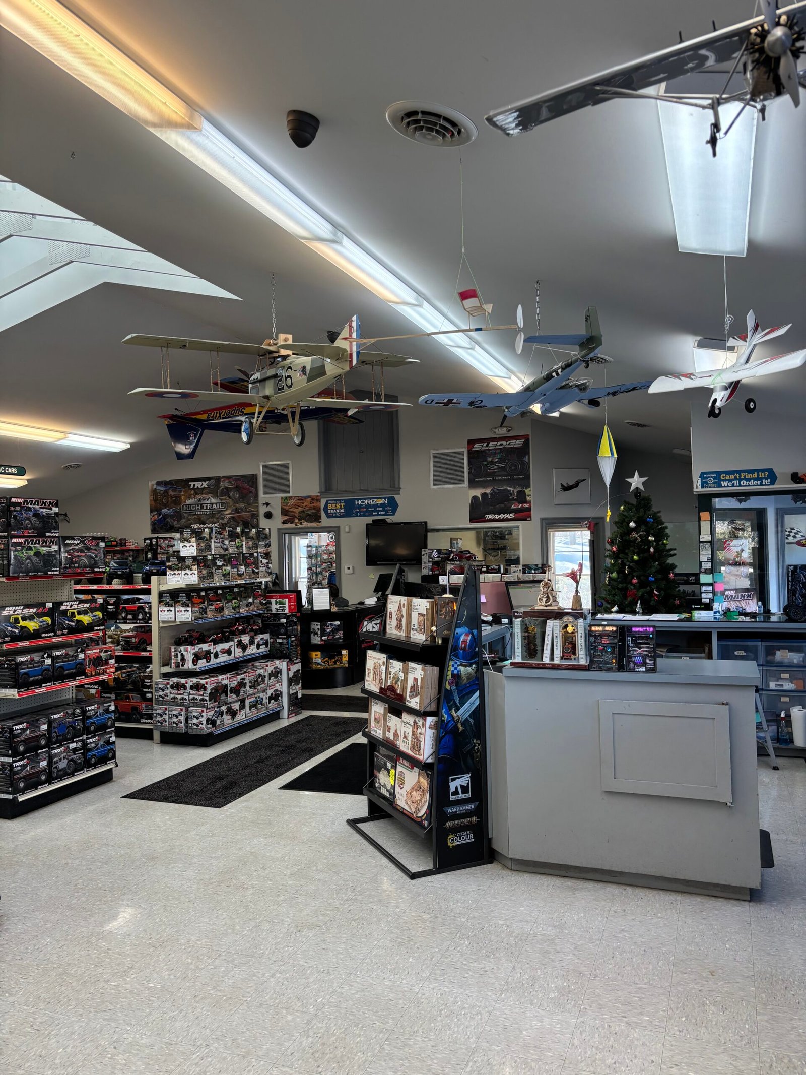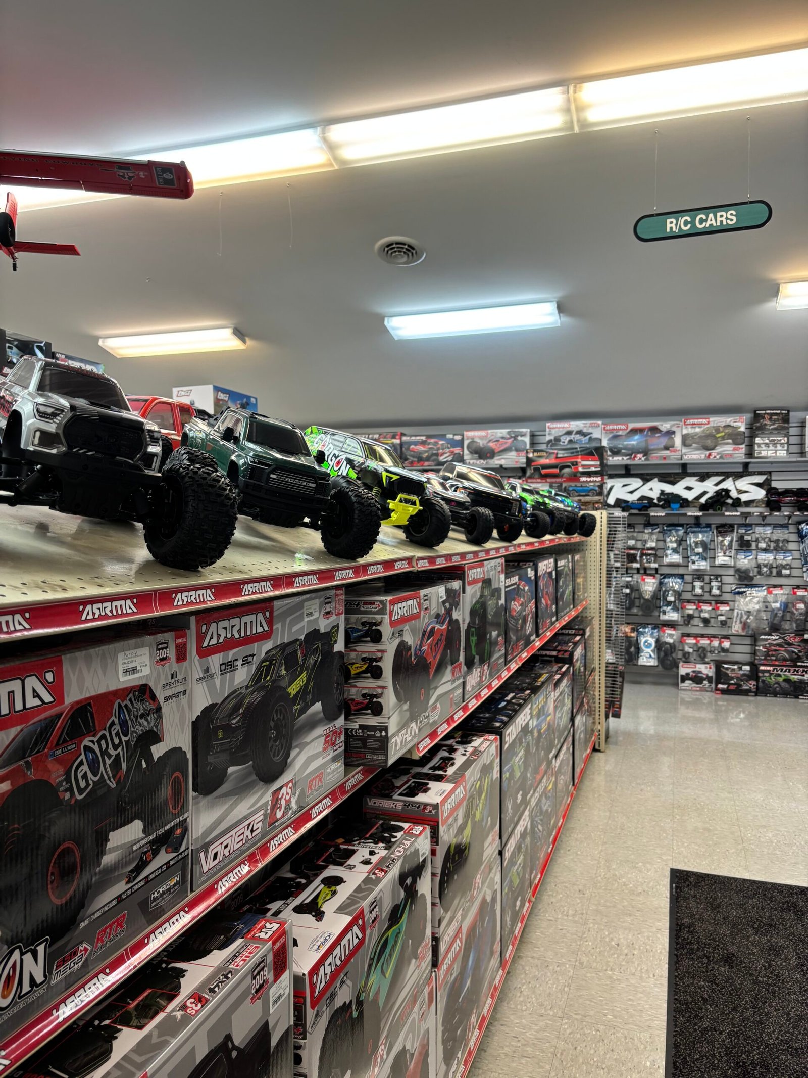We carry RC cars, planes, boats, helicopters, and drones, along with parts, batteries, and radios. Our shop also features model trains, Warhammer, hobby paints, rockets, and building supplies. Checkout our Hobby page for more info. RC repair support is available—just call or ask in store.